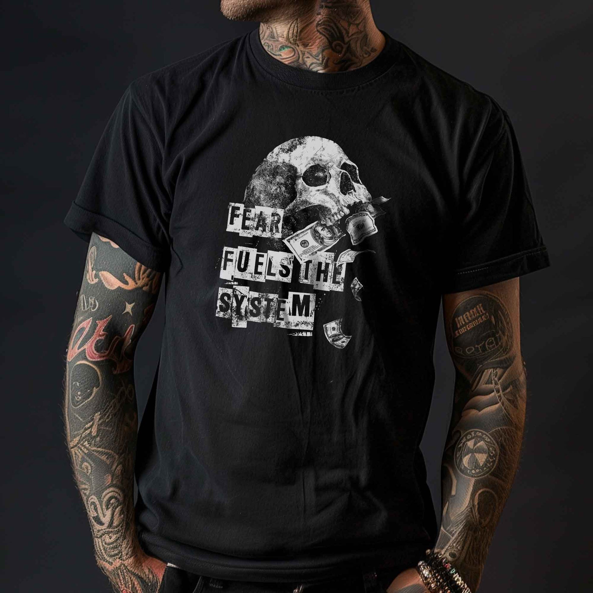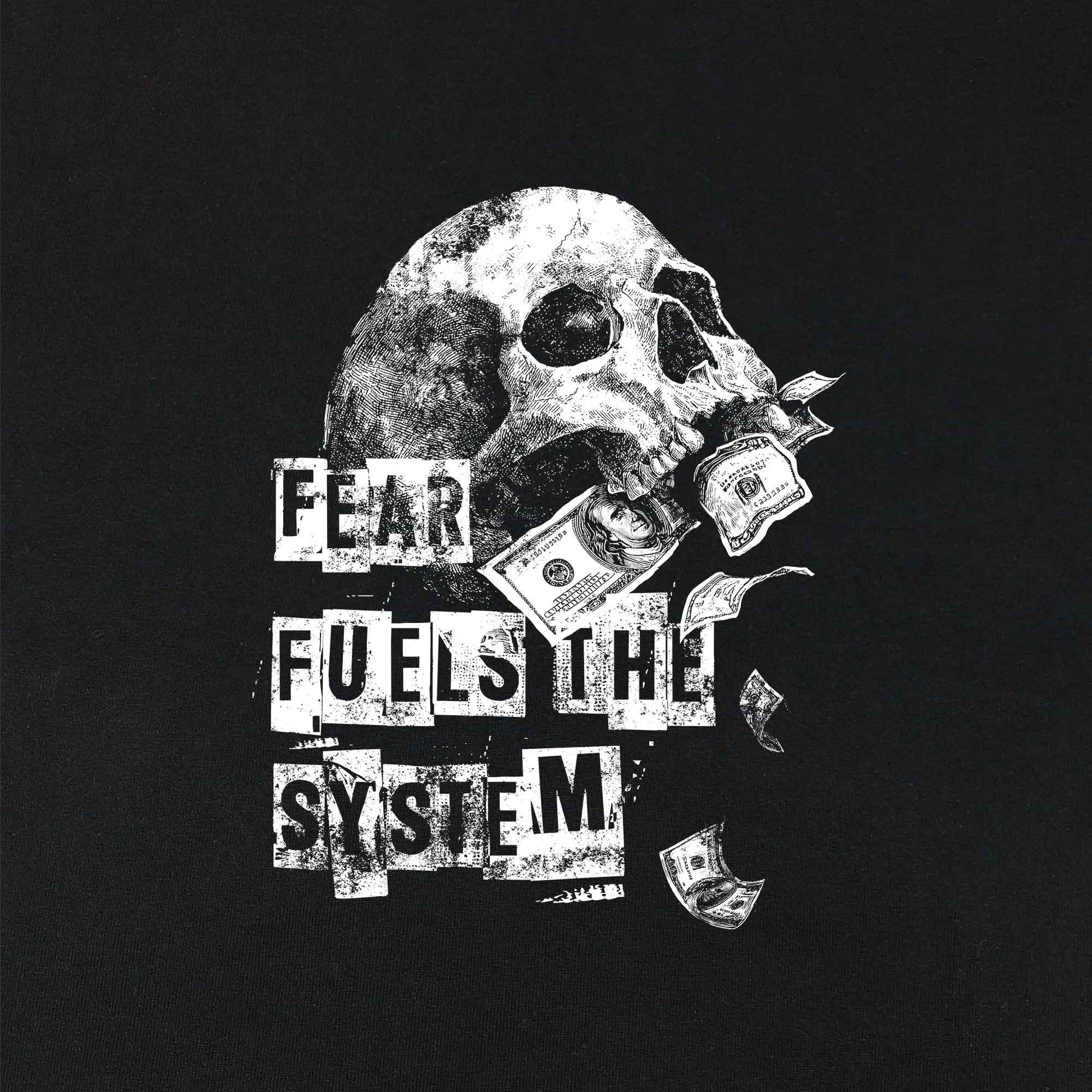 This shirt sums it up: Fear keeps the system running. The motif shows a skull devouring banknotes – a clear statement against exploitation, capitalism, and fearmongering.