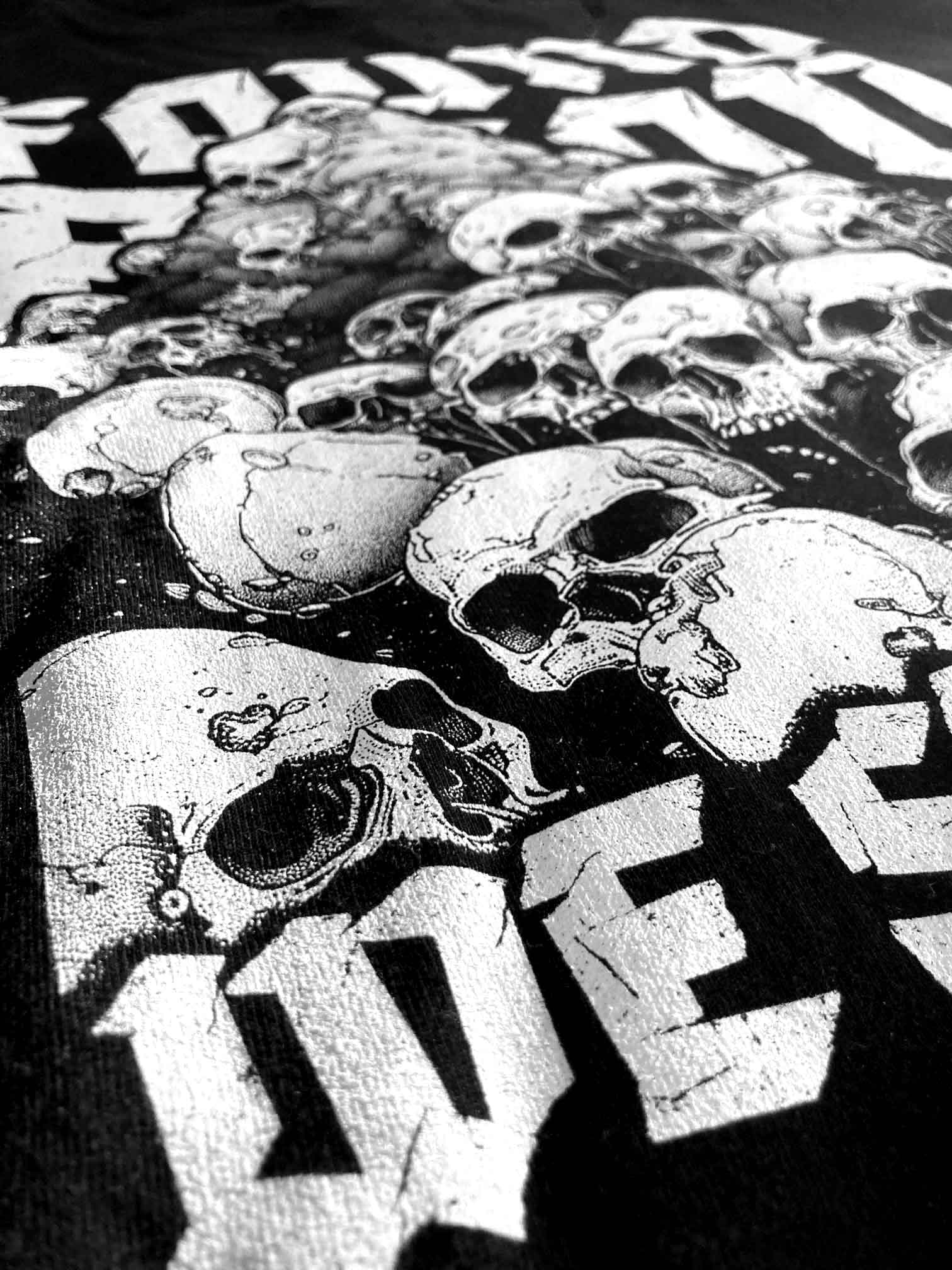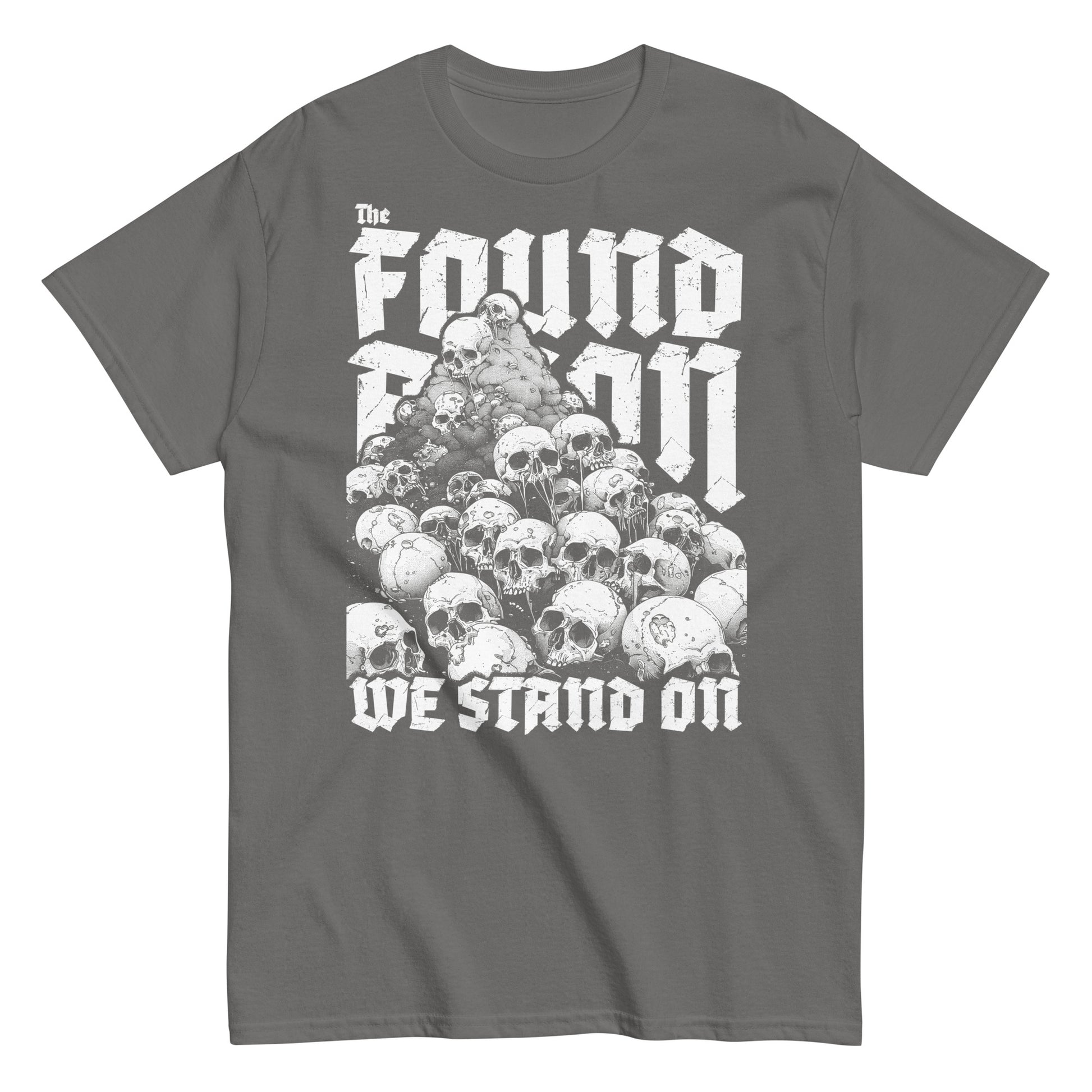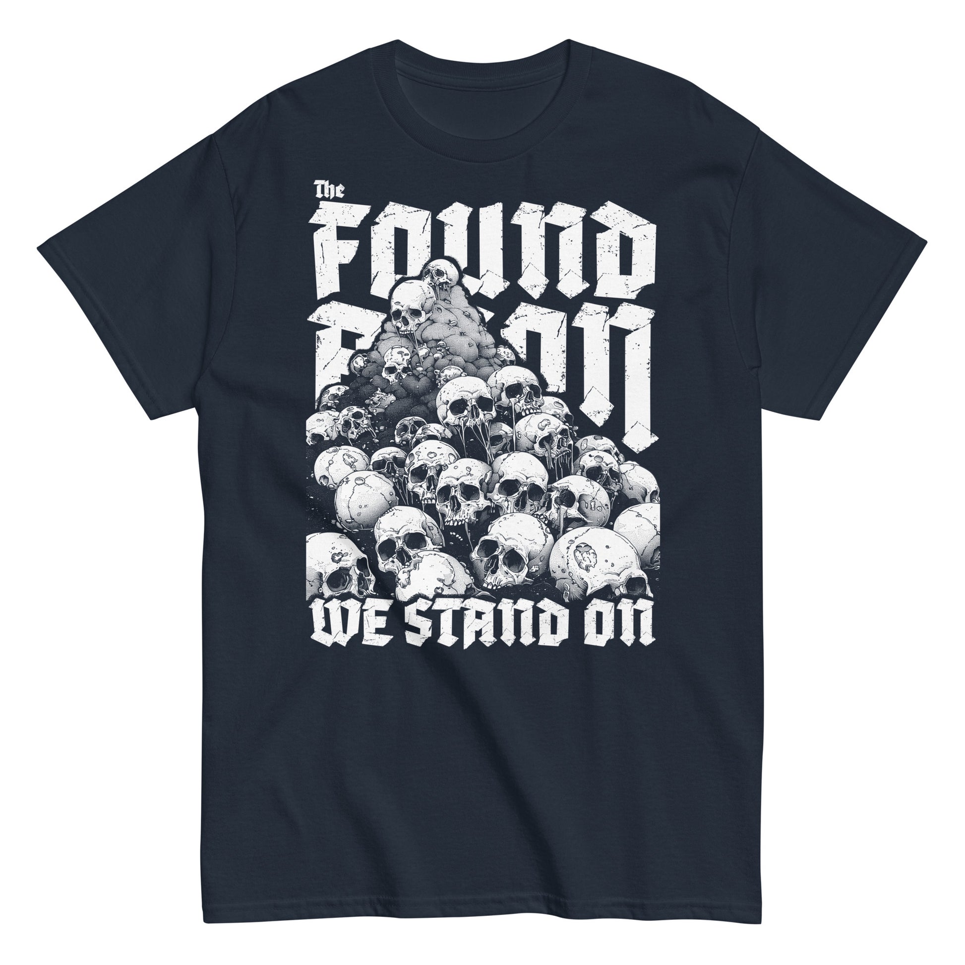 Dieses T-Shirt zeigt einen Berg an Totenköpfen, der mit dem Slogan "The foundation we stand on" eingerahmt ist. Motiv und Schrift sind weiß.