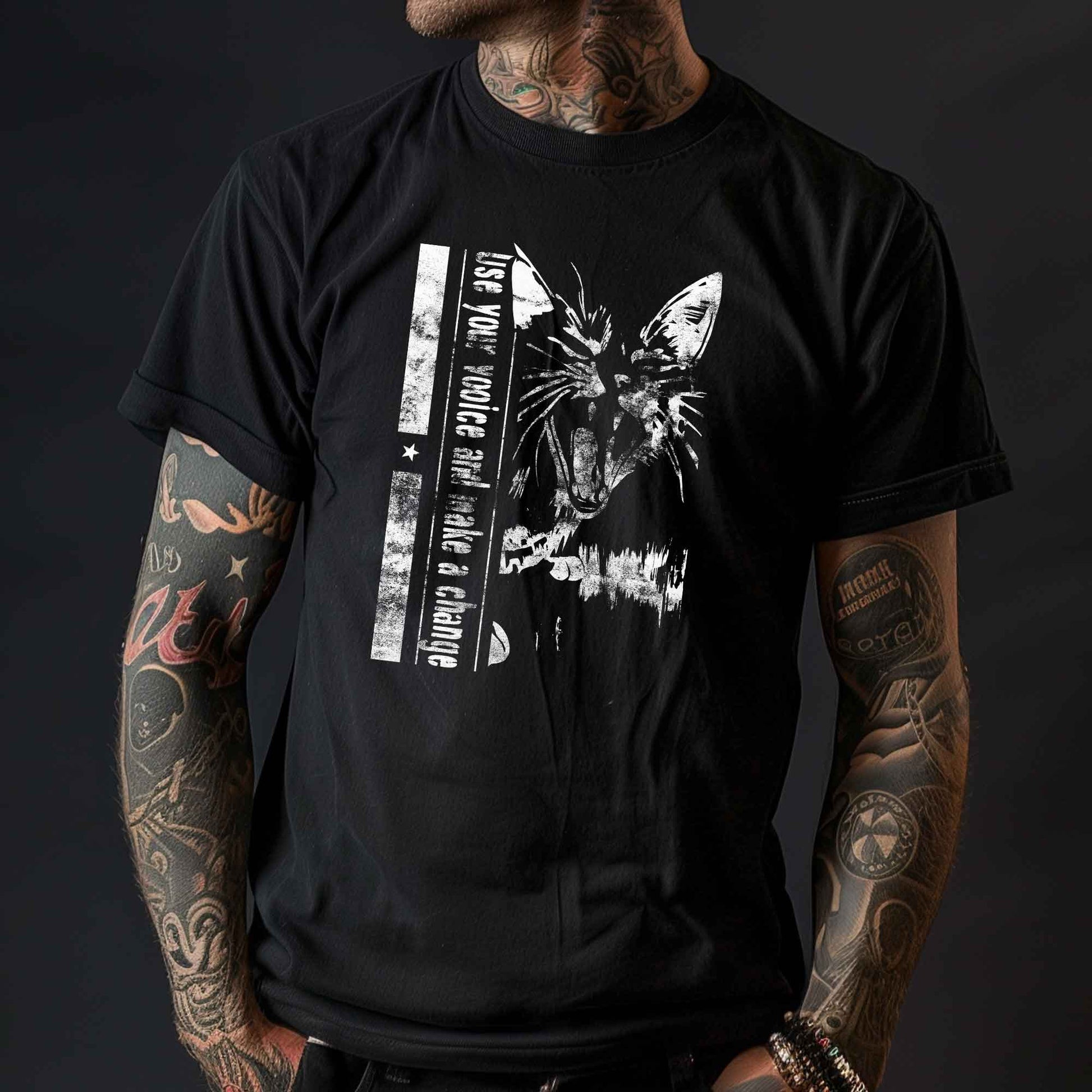 Dieses politische statement Punk-Shirt mit einer fauchenden Katze und dem Slogan "Use your voice and make a change" erinnert daran, dass jeder eine Stimme hat, und diese auch möglichst Laut nutzen sollte um Veränderung anzustoßen!